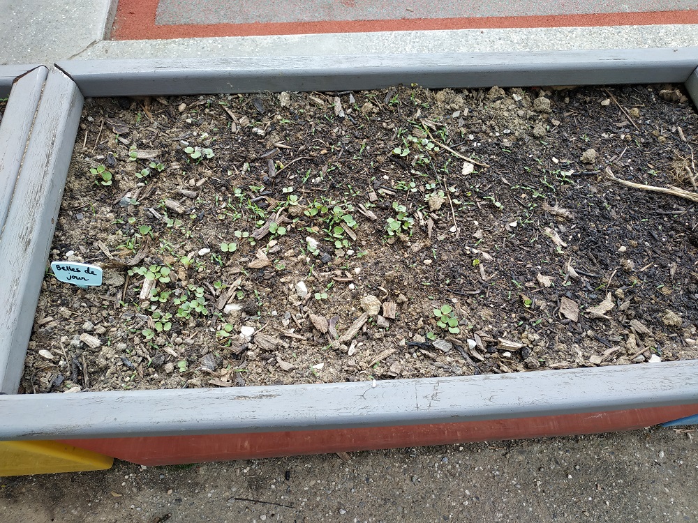 la pelouse a bien repoussé et les élèves peuvent désormais marcher dessus. Depuis la rentrée des vacances de printemps les élèves des 3 classes ont commencé un cycle jardinage dans le jardin de l'école mais également dans les bacs de la cour de récréation. Diverses plants ont été achetés mais également des graines et quelques petits fruitiers. Nous avons utilisé le compost de la station de bio-compost de l'école et ajouter un peu de terreau du commerce.